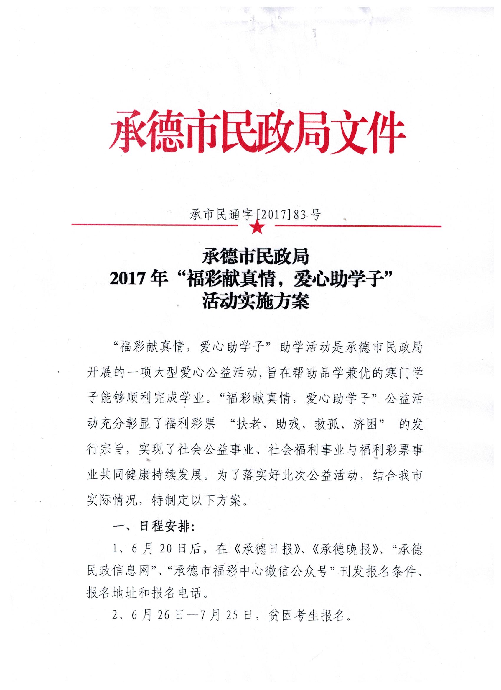 承德市民政局2017年“福彩献真情,爱心助学子”活动实施方案